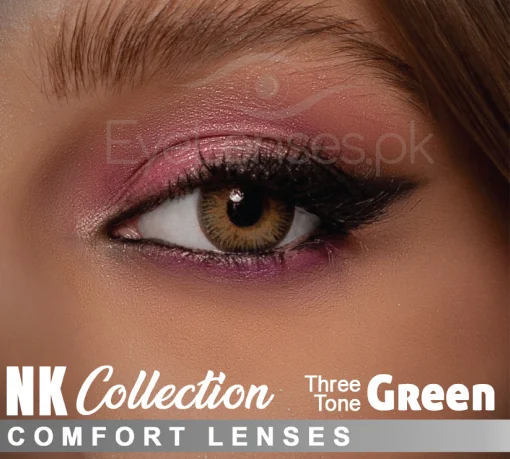 The Green (Three Tone) Nk Comfort Lenses are designed to enhance your natural eye color with a beautiful, multi-dimensional effect. Featuring a gradient of three complementary shades, these lenses create a striking yet subtle look, perfect for any occasion.